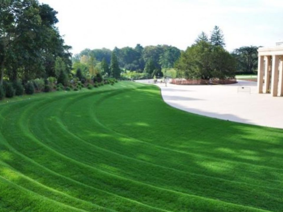 For the five tiers of terraced lawn (that’s 13,800 square feet!), we chose a mix of two varieties of Kentucky bluegrass and three varieties of tall fescue for early spring green color. Due to the slope of the terraced landform, we use a novel and innovative combination of overhead and subsurface irrigation systems to provide adequate and efficient hydration. An overhead system alone would not suffice because of the potential for water to run off the slope; the subsurface irrigation system combats the runoff and supplements irrigation. We keep the turf in pristine condition throughout the year with a hover mower, designed to scale the sloping surfaces of the lawn without marring the sculptural effect of the terraces.